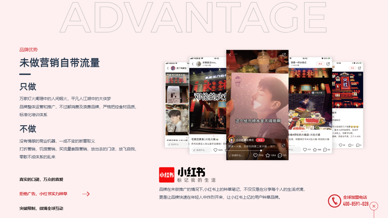 (愛(ài)蜀美極度注重用戶瀏覽網(wǎng)頁(yè)的舒適度和不被打擾性,非常反感一些營(yíng)銷(xiāo)工具的強(qiáng)制彈窗、反復(fù)彈出、狗皮膏藥似的占滿屏幕的四周,只保留必要的咨詢通道。所以我們只在網(wǎng)頁(yè)底部加入了一個(gè)加盟窗口,用戶可以隨時(shí)收縮/打開(kāi)窗口,在尊重用戶體驗(yàn)感的情況下,也體現(xiàn)了火社火鍋把服務(wù)放在首位的品牌理念↑)