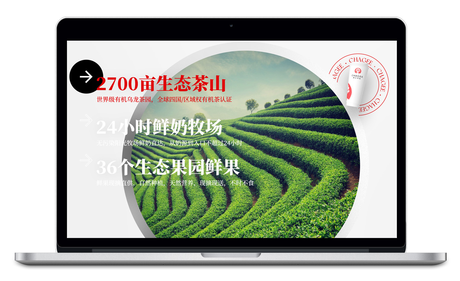 在官網(wǎng)第一屏的設(shè)計(jì)上,重點(diǎn)進(jìn)行品牌曝光,結(jié)合霸王茶姬別致的茶杯3D建模動(dòng)效,動(dòng)靜結(jié)合張弛有度,讓用戶的視覺(jué)聚焦到我們想要傳達(dá)的信息,目中所及腦中所想皆只有霸王茶姬,消除其他因素對(duì)用戶瀏覽網(wǎng)站的干擾。